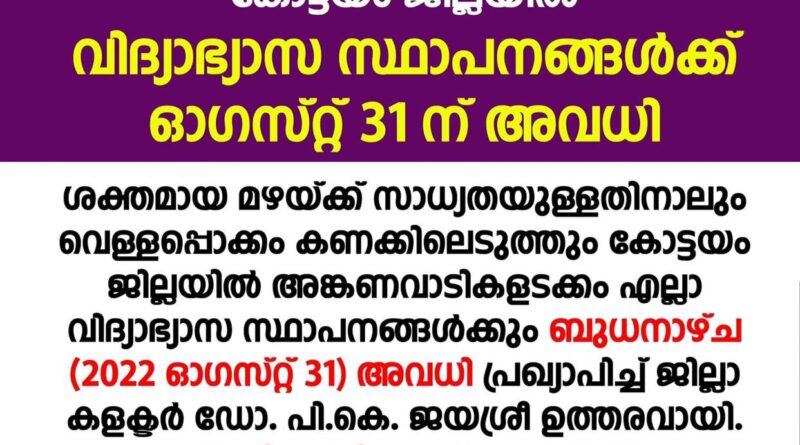 ശക്തമായ മഴയ്ക്ക് സാധ്യതയുള്ളതിനാലും വെള്ളപ്പൊക്കം കണക്കിലെടുത്തും കോട്ടയം ജില്ലയിൽ അങ്കണവാടികളടക്കം എല്ലാ വിദ്യാഭ്യാസ സ്ഥാപനങ്ങൾക്കും ബുധനാഴ്ച (2022 ഓഗസ്റ്റ് 31) അവധി പ്രഖ്യാപിച്ച് ജില്ലാ കളക്ടർ ഡോ. പി.കെ. ജയശ്രീ ഉത്തരവായി. പ്രൊഫഷണൽ കോളജുകൾക്കും അവധിയാണ്. മുൻ നിശ്ചയിച്ച സർവകലാശാല പരീക്ഷകൾക്ക് അവധി ബാധകമല്ല.