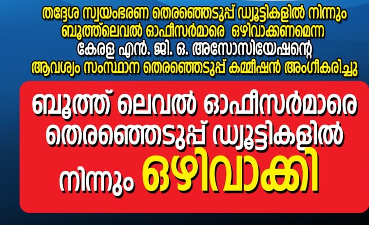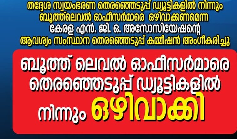 തദ്ദേശ തിരഞ്ഞെടുപ്പ് ഡ്യൂട്ടി: ബൂത്ത് ലെവൽ ഓഫീസർമാരെ ഒഴിവാക്കി; എൻ.ജി.ഒ. അസോസിയേഷൻ്റെ ഇടപെടൽ വിജയം കണ്ടു